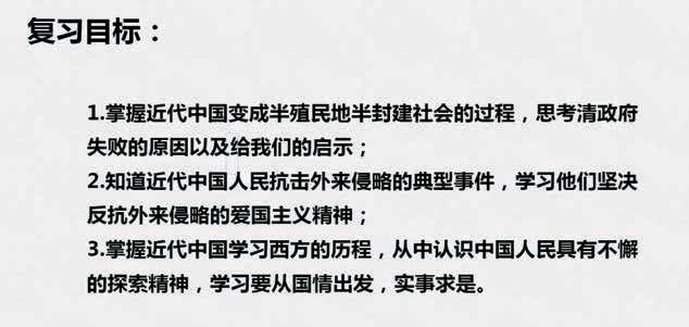 本节课的复习内容围绕四个专题展开,分别是①恨——列强之侵略;②敬——人民之抗争; ③思—— 先辈之探索; ④志—— 读书而复兴。在每个专题的学习过程中, 我按照“ 提问——自学——练习——总结”的学习步骤依次展开,让同学们循序渐进的掌握每个专题的要点。